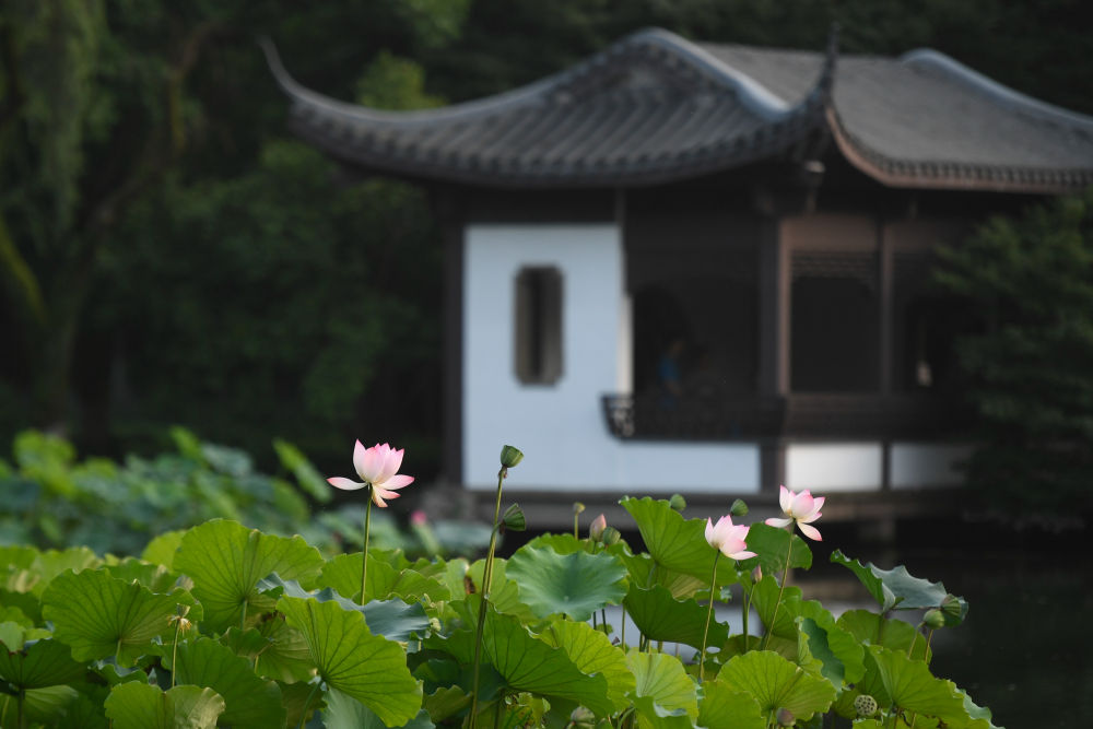 ↑古装演员在西溪湿地参加宋韵花朝节水上巡游。