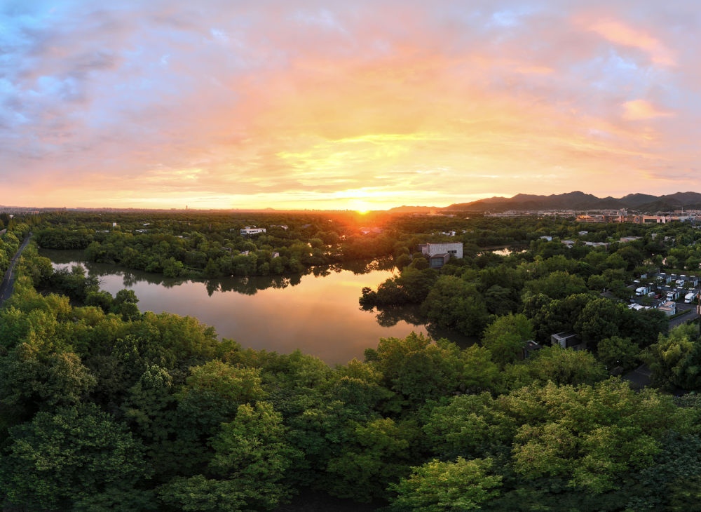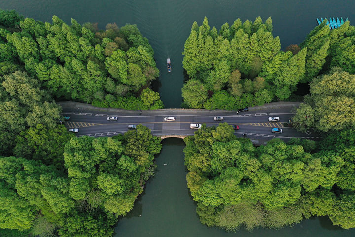 ↑空中俯瞰东洲岛。东洲岛位于北支江上游与富春江交汇口。