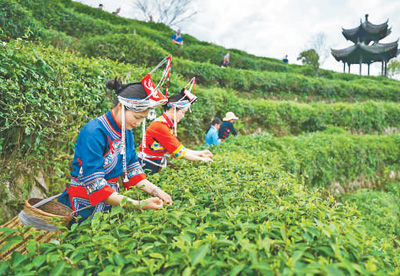 丽水市景宁畲族自治县三石村的畲族姑娘在马岭头茶山采茶。