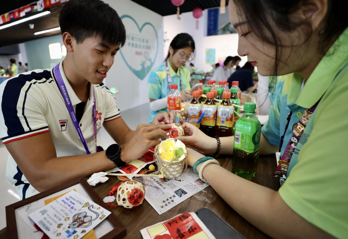9月29日,中国香港运动员张颂灏(左)体验制作灯笼。中国日报记者 张威 摄