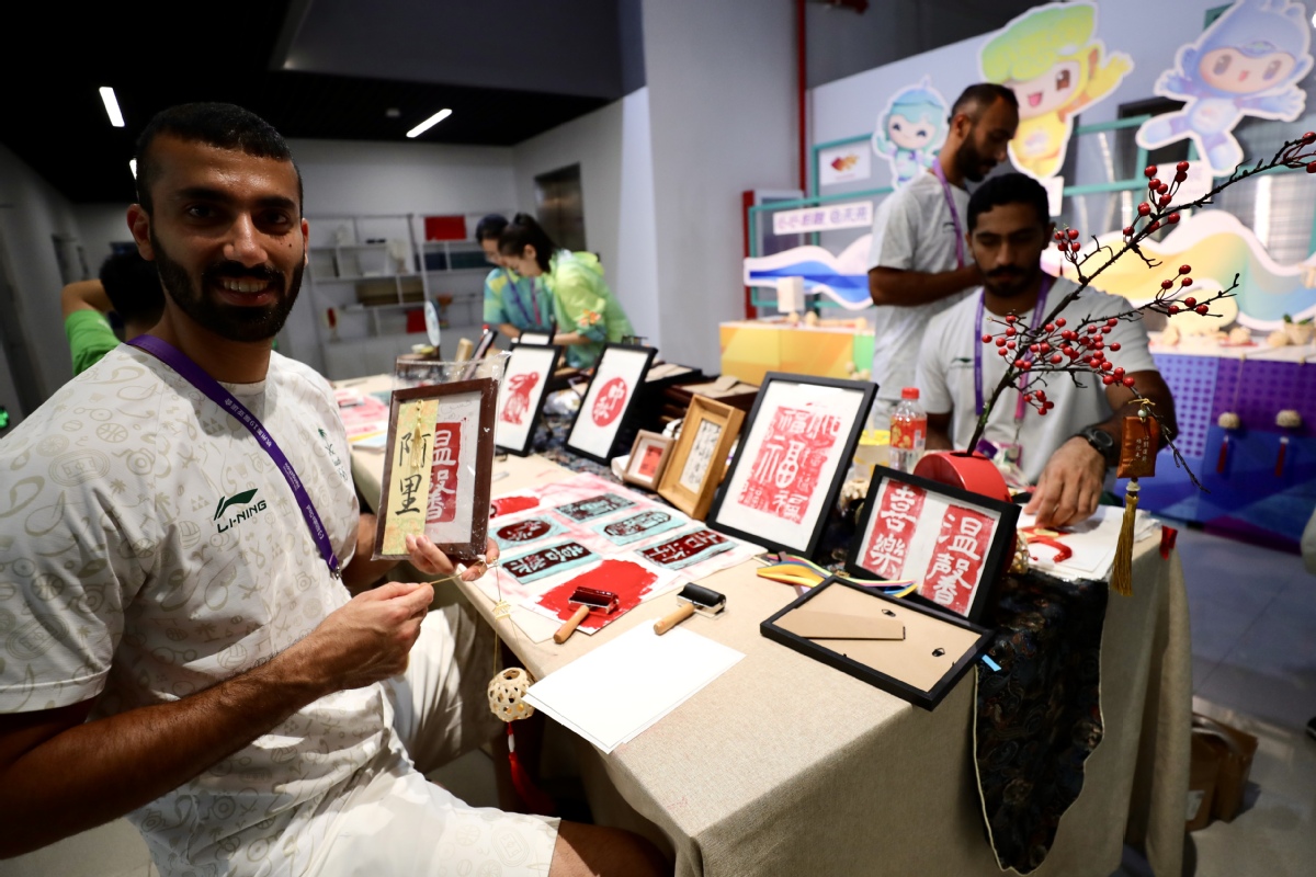 9月29日,沙特阿拉伯运动员阿里·伊萨·I·阿卜杜勒加尼(左)体验拓印。中国日报记者 张威 摄