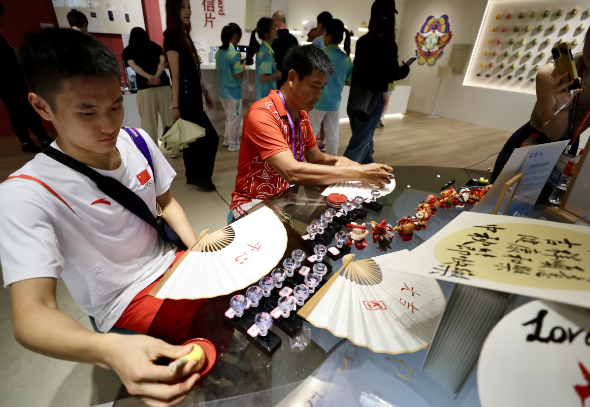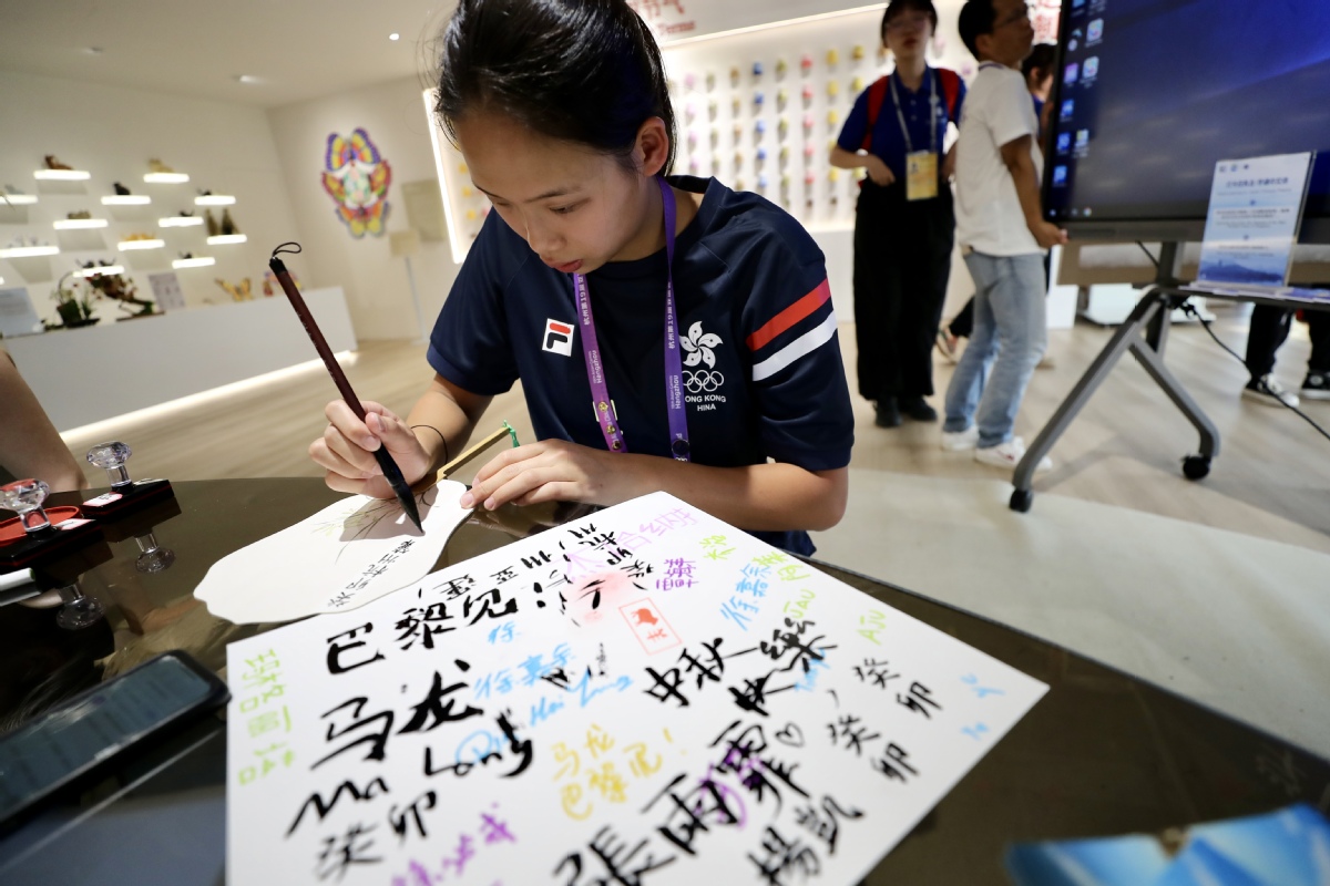9月29日,中国香港运动员杨凯晴在团扇上写毛笔字。中国日报记者 张威 摄