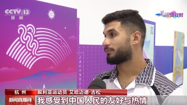 叙利亚运动员 艾哈迈德·古松:今年已经是我第三次来中国比赛了。当我走在街上,我可以看到很多人向我问好,欢迎我们来到这里。而且一旦我们需要帮助,很多人都来为我们提供帮助。来到这里就像回家一样,而且哪里都是那么干净美丽,场馆也是我见过的最棒的场馆,谢谢中国给亚洲带来了一场如此精彩的亚运会。
