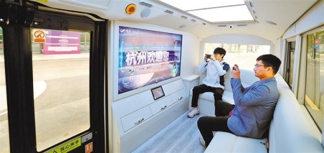杭州亚运村的无人驾驶智能巴士搭载的30°800万像素相机,可感知600米范围内的车辆和300米范围内的行人,并自动规划、实施避让方案。乘客通过车窗可以看到车外虚实结合的互动体验。