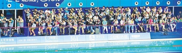 摄影记者在杭州奥体中心游泳馆拍摄。通过三维模型,工作人员可以查看场馆内部,进行云上巡检。