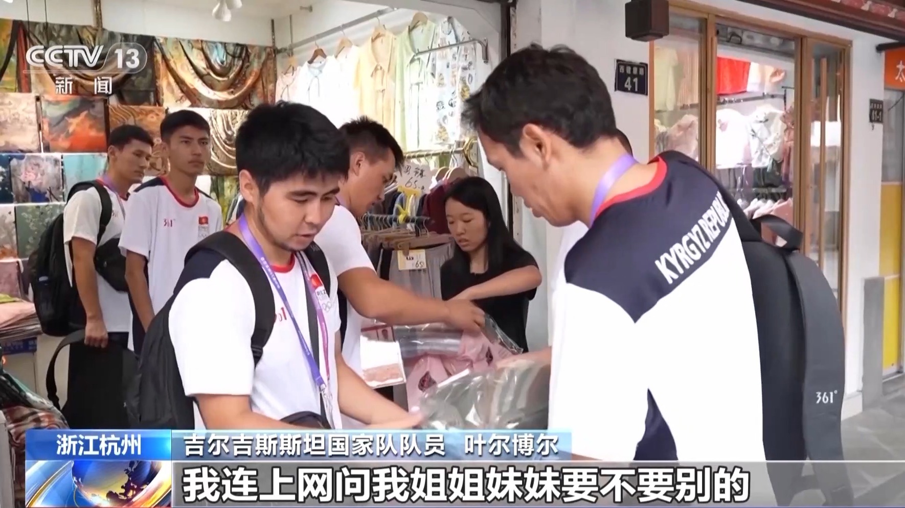 回国之前,吉尔吉斯斯坦运动员叶尔博尔(Erbol)和同伴们抓紧时间在杭州到处逛逛,准备给家乡的亲朋好友们买一些慕名已久的杭州丝绸。