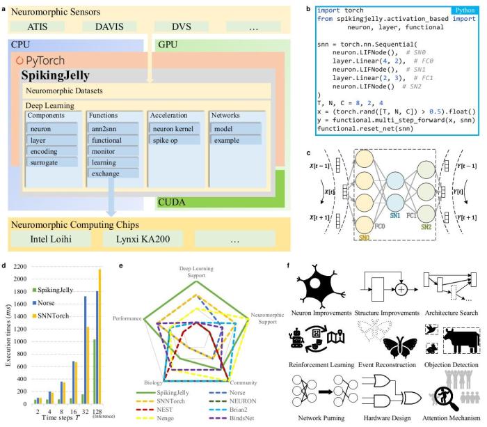 “惊蜇”(SpikingJelly)框架的整体结构、示例代码、仿真速度、生态位以及典型应用。中国科学院自动化所 供图