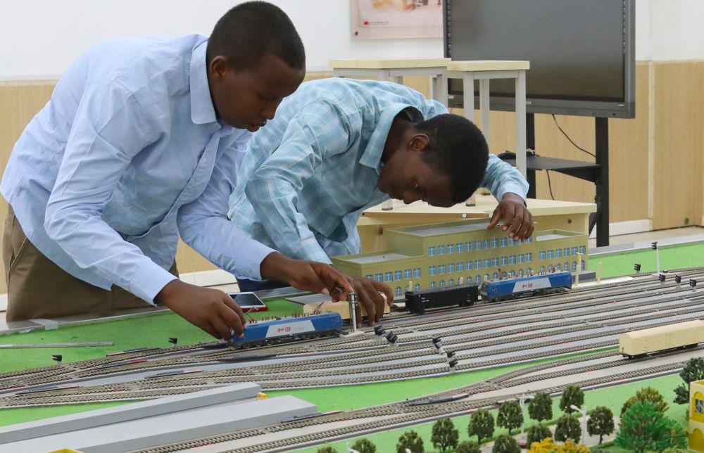 2022年9月19日,在位于吉布提首都吉布提市的工商学校,学生在鲁班工坊铁道运营沙盘教学区学习。