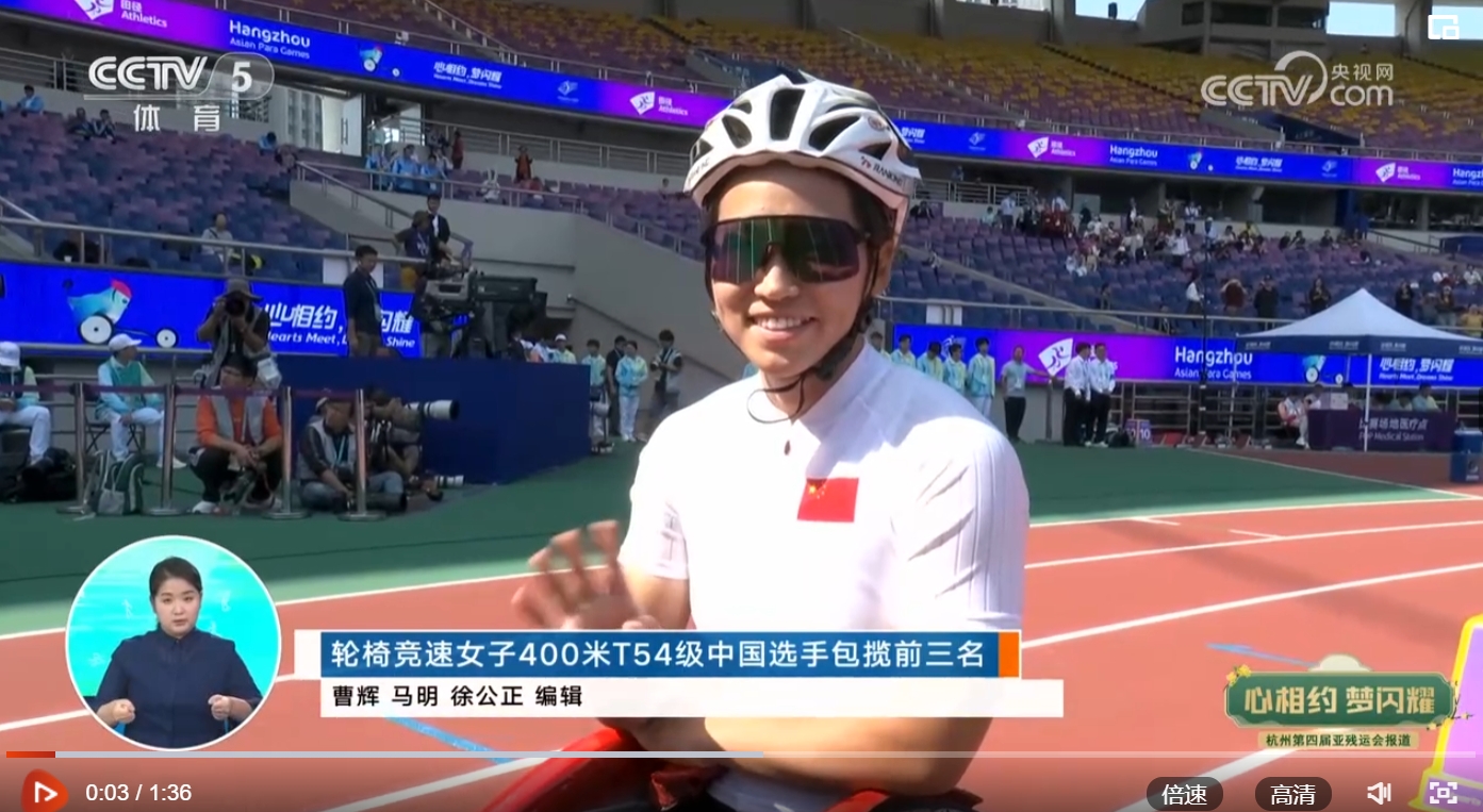 北京时间10月24日,杭州亚残运会轮椅竞速女子400米T54级决赛展开争夺,中国选手包揽前三名。