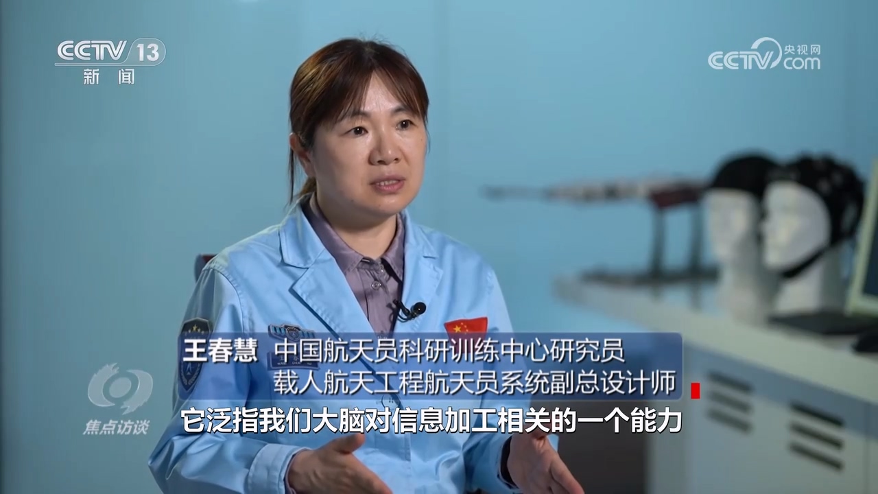 中国航天员科研训练中心研究员、载人航天工程航天员系统副总设计师王春慧:“我们通常说,认知能力泛指大脑对信息加工相关的能力,记忆、观察、决策等。航天员在天上完成的任何一件工作,都需要认知能力支持。”
