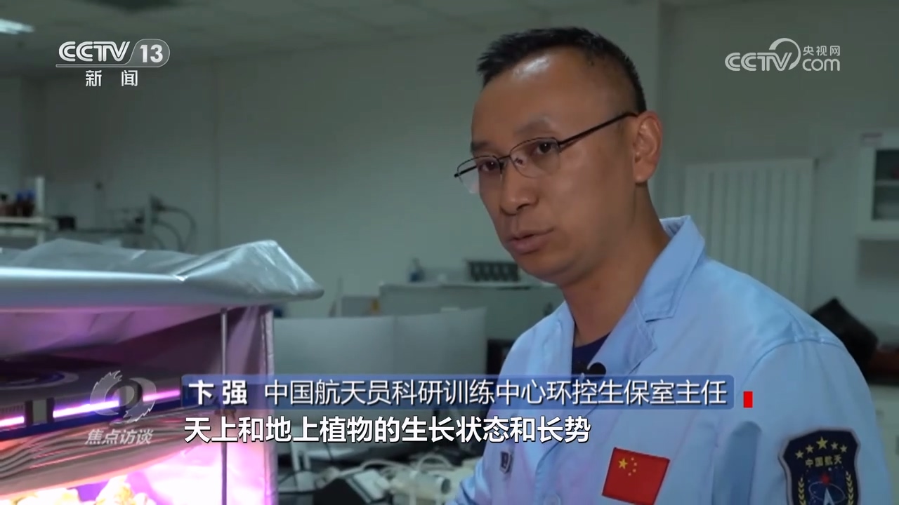 中国航天员科研训练中心环控生保室主任卞强:“我们这个和天上太空菜园一模一样,与天上同步进行植物栽培、浇灌、间苗等一系列活动,就是要对比天上和地上植物生长状态和长势有什么不一样的地方。”