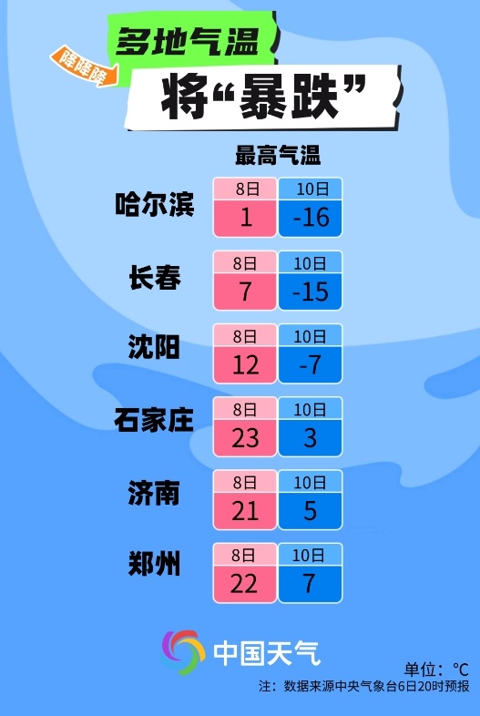 8日至9日,第二股冷空气接力来袭。届时,内蒙古、华北、黄淮、东北地区气温将下降4~8℃,内蒙古东部、东北地区中南部降温幅度可达10℃以上。