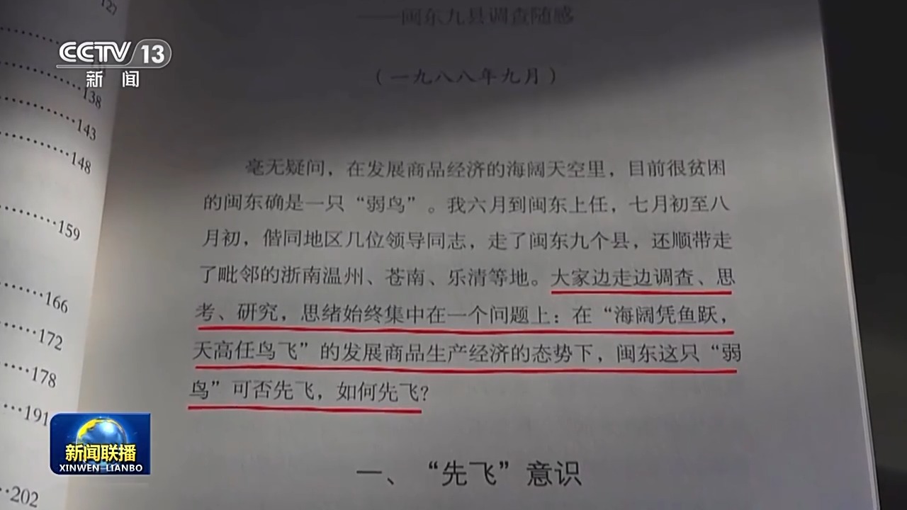 中共福建省委党校(福建行政学院)党建教研部副主任 高莹:习近平同志把当时还很贫困的闽东比喻为一只“弱鸟”,他紧紧围绕闽东地区如何摆脱贫困、加快发展这一主题,进行了广泛的调查研究,提出了弱鸟先飞、滴水穿石等许多富有远见的理论、观点和方法,厘清了闽东地区发展的具体思路。