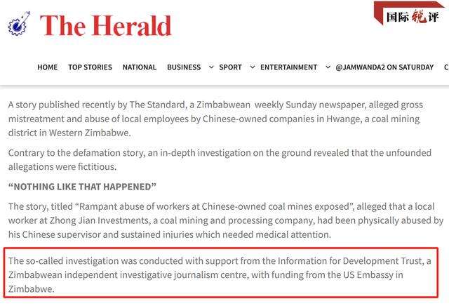 2022年5月,津巴布韦媒体《标准报》发布了一篇报道,污蔑中国矿企虐待当地员工,称这名员工“受伤送医,还被解雇了”。这家媒体称,报道是和津巴布韦一个名叫“信息促进发展信托基金(IDT)”的机构合作完成的。然而很快,津巴布韦《先驱报》就发文,用大量事实证明,这名员工只是和中方员工发生了小口角,并没有被殴打,也没有被解雇。