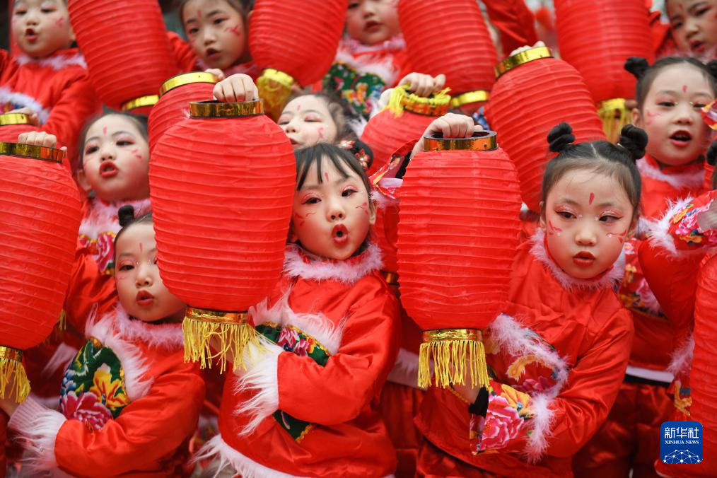 1月18日,四川省阆中市阆中古城,民间艺人和文艺工作者在表演节目欢度腊八节,喜迎农历新年。这是参演的小朋友在表演。