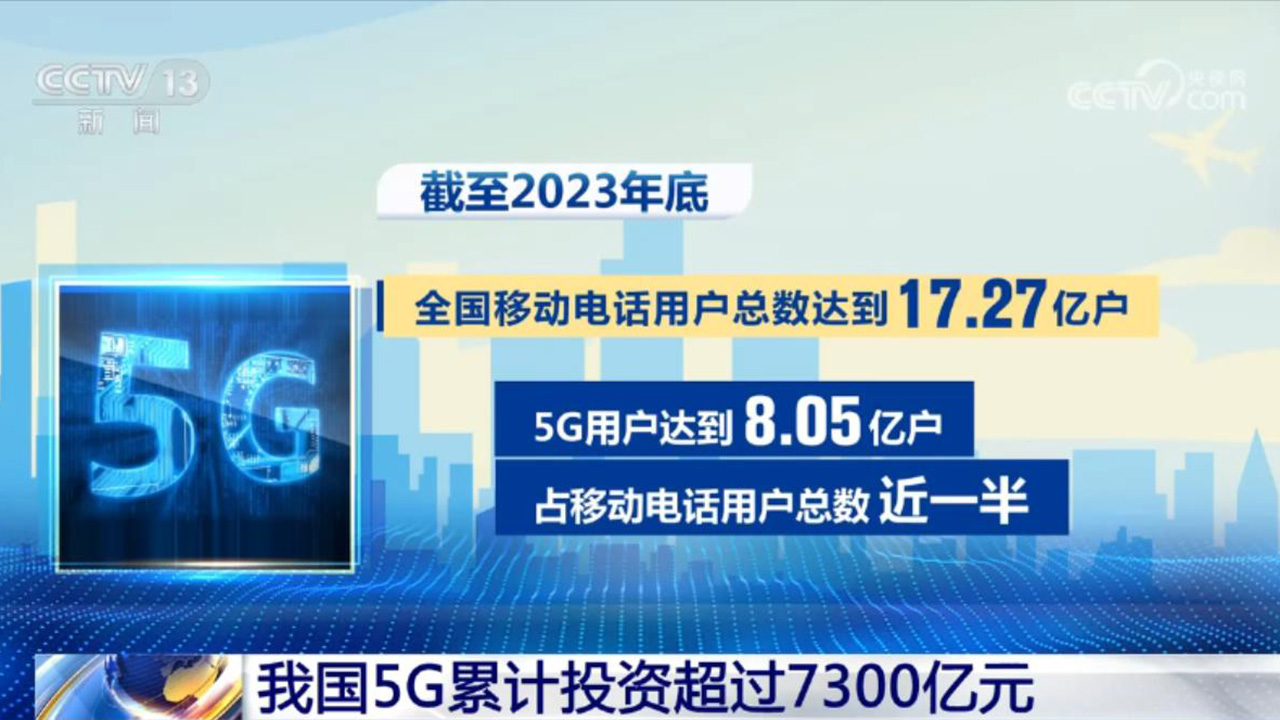截至2023年底,全国移动电话用户总数达17.27亿户,其中,5G用户达8.05亿户,占移动电话用户总数的近一半;5G基站总数达337.7万个,在移动通信基站总数中占比近三成。