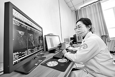 青海省海东市化隆回族自治县人民医院影像中心医生为患者DR远程数字影像做诊断。新华社发
