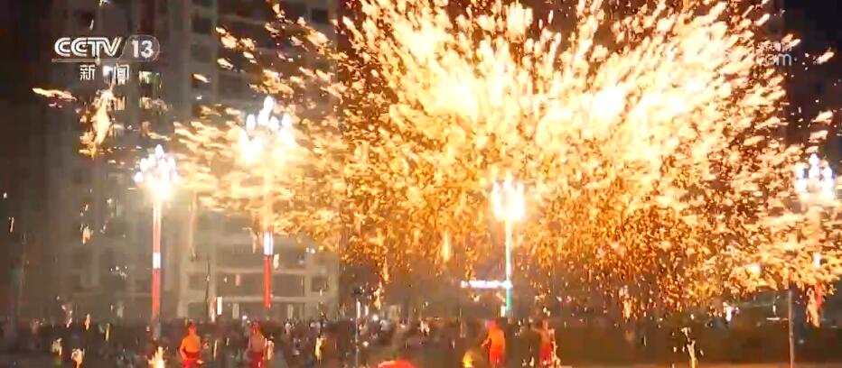 晚上七点半,随着精彩的焰火流星雨瀑布,正式拉开了民俗非遗表演的序幕。夜空中,非遗传承人将1600摄氏度高温的铁汁抛起,再用木板打向空中,铁水迅速崩裂开来,一串串耀眼的铁花在夜空绽放,像满天繁星雨点般落下。