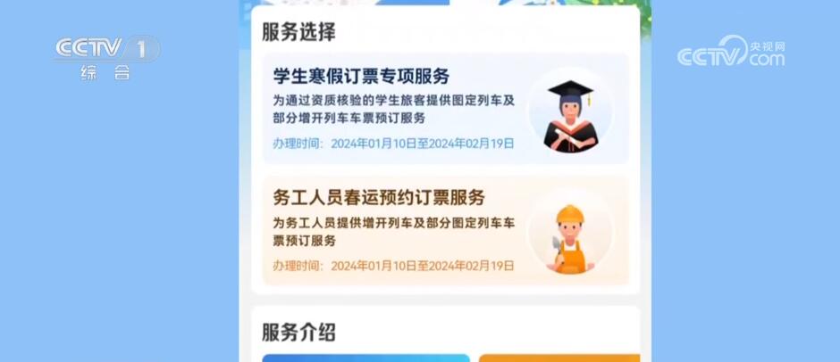 今年春运,铁路部门推出预约购票和预填购票两项购票新方式,预约购票功能专门针对学生和务工人员。符合条件的学生旅客(已通过学生优惠资质核验且有剩余优惠乘车次数)可通过“学生寒假订票专项服务”专区预约购买春运期间的火车票。已通过实名制核验的务工人员可通过“务工人员春运预约订票服务”专区预约购买春运期间火车票。