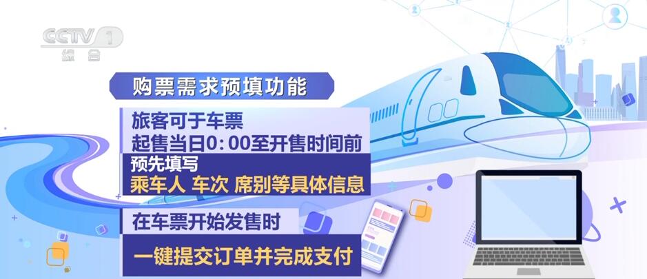铁路部门今年还增加了购票需求预填功能,旅客可于车票起售当日0:00至开售时间前,预先填写乘车人、车次、席别等具体信息,在车票开始发售时一键提交订单并完成支付。