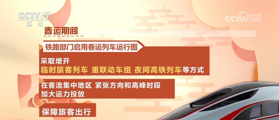 春运期间,铁路部门启用春运列车运行图,采取增开临时旅客列车、重联动车组、夜间高铁列车等方式,在客流集中地区、紧张方向和高峰时段加大运力投放,保障旅客出行。国铁济南局春运期间安排临客超90对,其中开行去往北京、上海、石家庄、哈尔滨、福州等方向跨省临客47对。国铁武汉局春运首日加开临客49对,哈尔滨铁路部门安排开行临客列车74对,太原铁路部门安排开行临客列车64对。