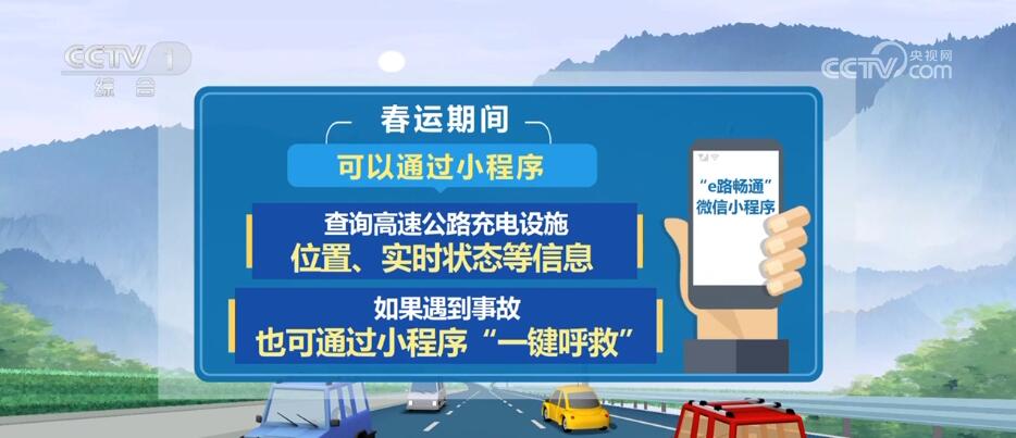 为提升今年春运服务,交通运输部还上线“e路畅通”微信小程序,春运期间,大家可以通过小程序,查询高速公路充电设施位置、实时状态等信息,如果遇到事故,也可通过小程序“一键呼救”。
