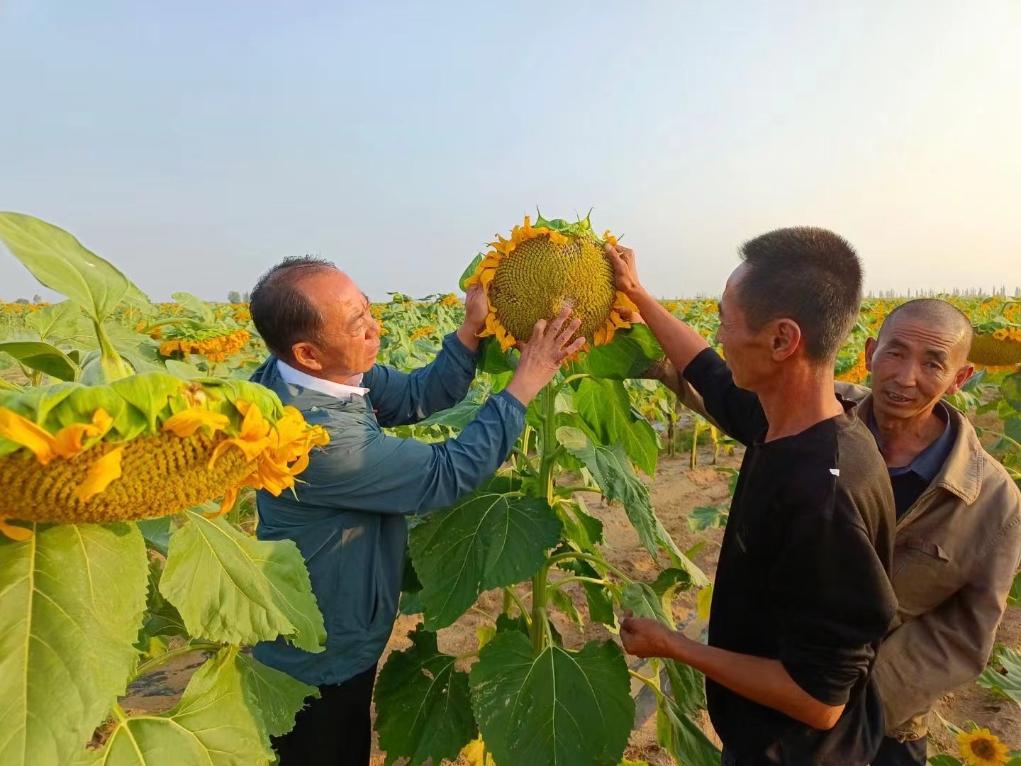 王占荣(左一)和村民在村里查看种植的葵花。王艳 摄