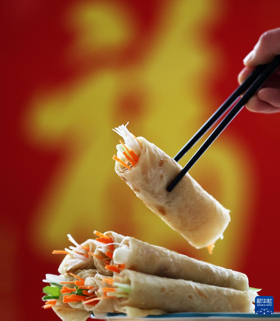 2月4日,山东省临沂市郯城县郯城街道龙泉社区居民展示自己做的春饼。
