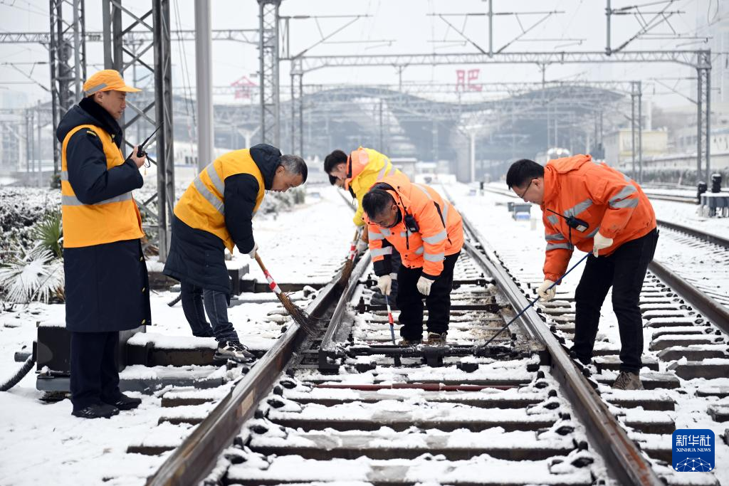 2月4日,合肥站工作人员在清扫道岔积雪。
