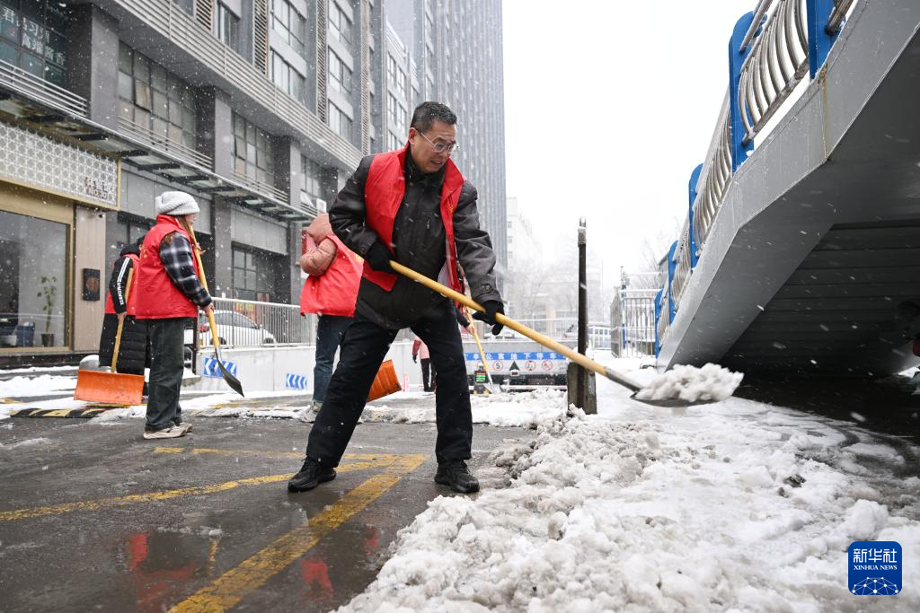 2月4日,在合肥市包河区芜湖路街道兰亭社区,社区工作人员在清扫路面积雪。