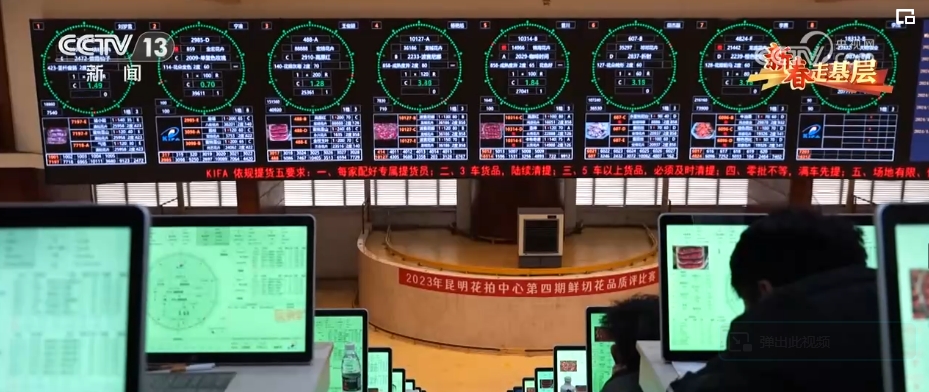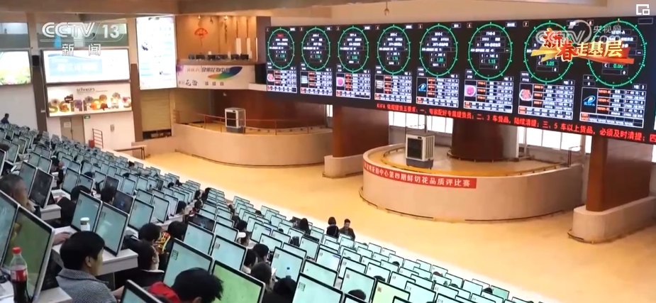 这里是昆明花卉拍卖交易中心,年交易量近25亿枝,高峰期每天交易量1100多万枝。这里的3000多位鲜花经纪人链接着3万多家供货商。这里的40多个品类、3000多个品种的鲜切花,市场遍及全球40多个国家和地区。这里的拍卖交易中心,平均每一笔花的交易时间不到4秒,但凡有点犹豫,就拍不到自己想要的花。
