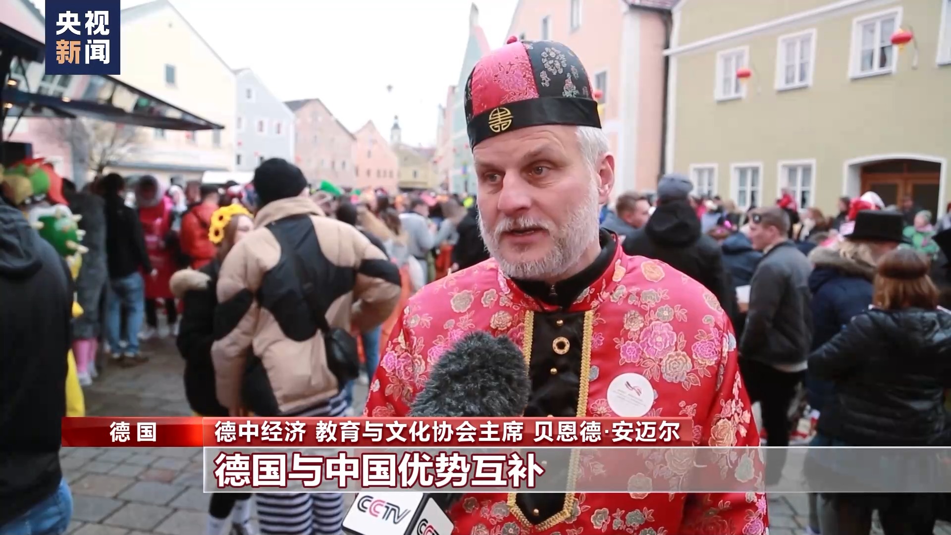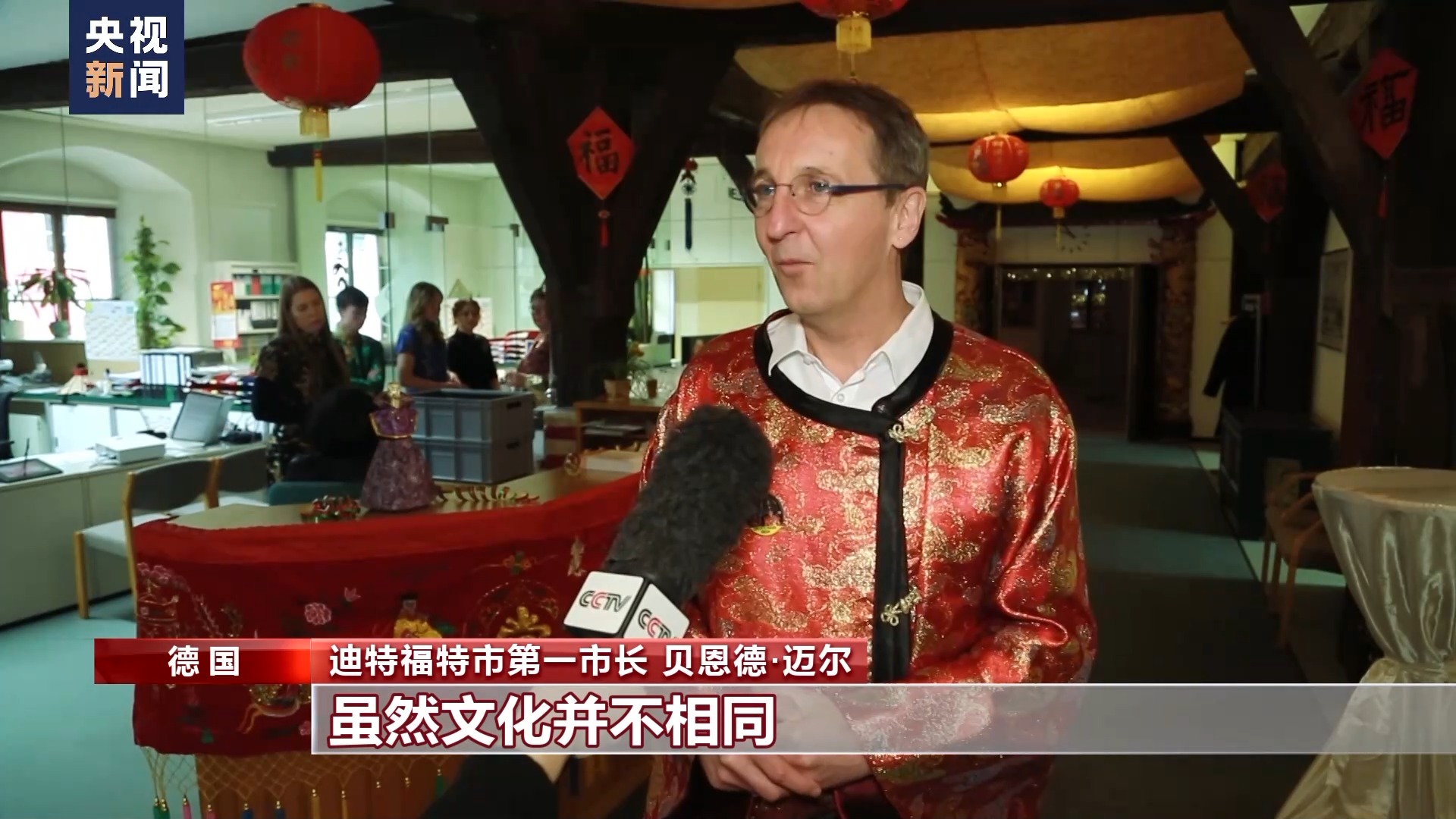 总台记者 阮佳闻:节日期间的迪特福特随处可见中国传统文化元素,主要街道都悬挂着红灯笼、福字和彩旗,很多店铺还贴上了中文的吉祥用语,整个市政厅更是洋溢着浓浓的中国年味。
