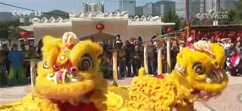 锣鼓喧天、金龙舞动、醒狮齐跃,精彩的舞龙舞狮表演吸引大批澳门市民和游客驻足观看,现场热闹非凡。