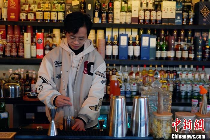 安吉余村乡音小馆调酒师何振新在为客人调酒。黄斌供图