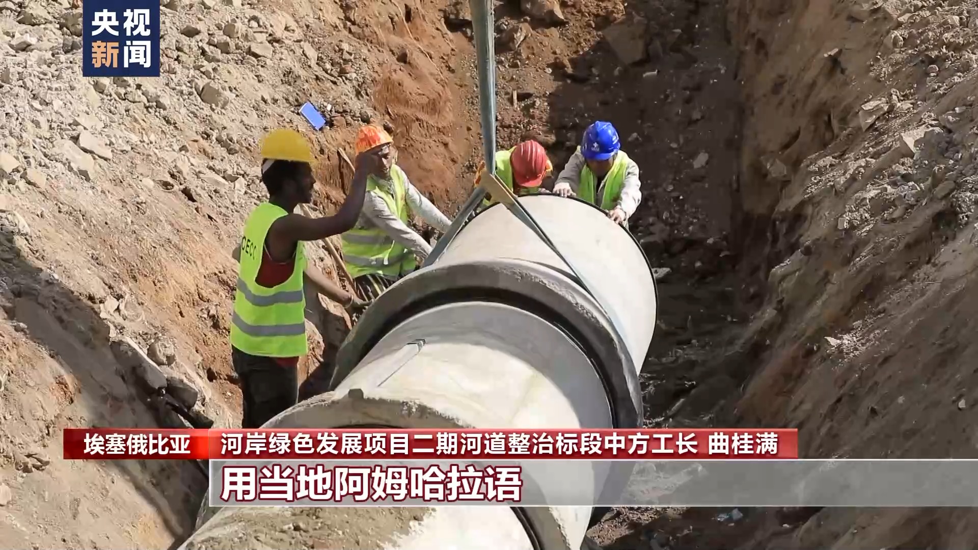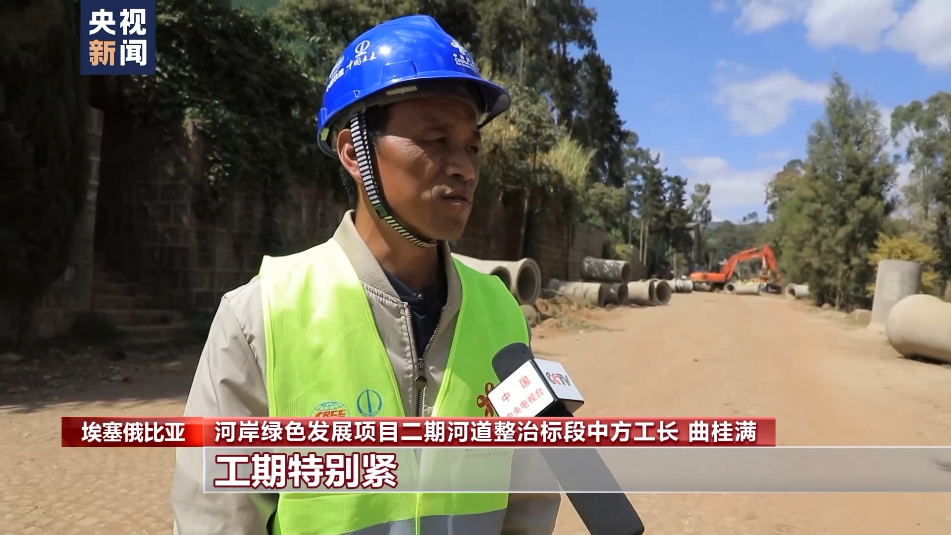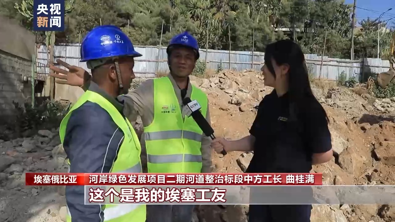 河岸绿色发展项目二期河道整治标段中方工长 曲桂满:有当地语,不会说的我也加点汉语。基本我能跟他们沟通明白,用当地阿姆哈拉语。我就跟他们工人自己自学的,每天学一个单词,这一年就学不少。打个比方“一”读“安特”,今天就我记了一个“一” 。