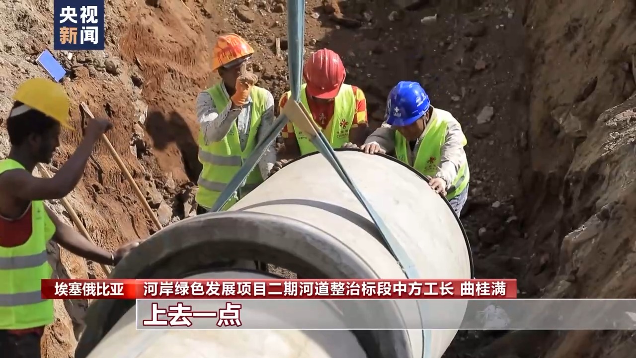 河岸绿色发展项目二期河道整治标段中方工长 曲桂满:再多一点,多一点,上去一点。看一看,往左一点,往左一点。往左一点,往右一点,好。