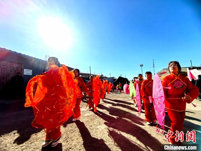 中新网吕梁2月16日电 (范丽芳 白鹏伟)正月里来是新春,火红的秧歌扭起来。春节期间,山西吕梁方山县马坊镇吴家沟村张灯结彩,150多名村民自发组织秧歌队,在热闹的正月里“扭”出别样风情。