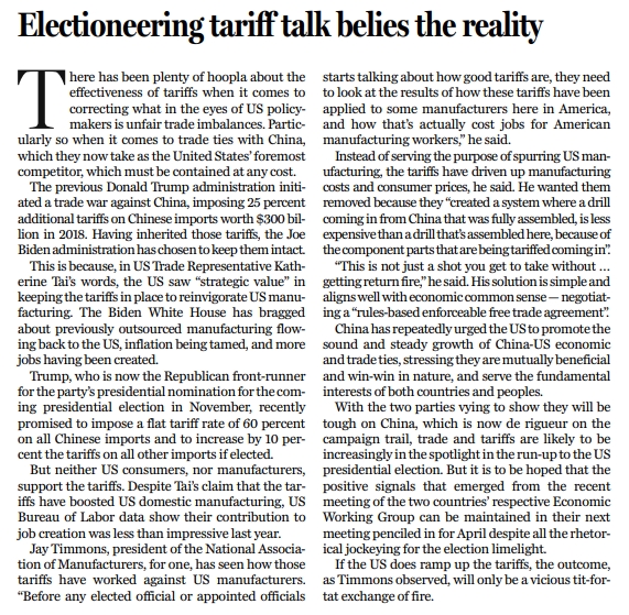 美国总统大选将至,当前两党自然要按照惯例竞相展示“对华强硬”的立场,在这样的背景下,伴随着选战的逐步推进,贸易与关税也将进一步成为聚焦的议题。但抛开为选战“造势”的各种“狠话”不提,也希望来自近期中美经济工作组会议上的积极势头能够保持,并延续至暂定于4月的下一次会议之上。