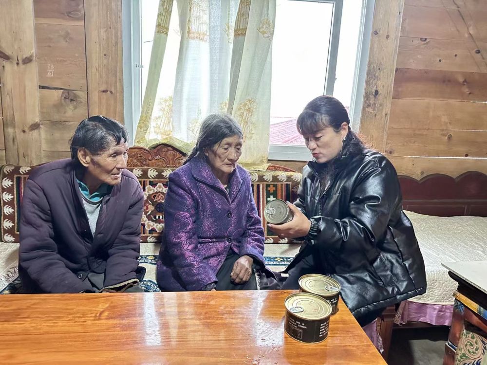 罗布央宗(右)在西藏墨脱县墨脱村看望村民(2023年2月摄)。新华社发