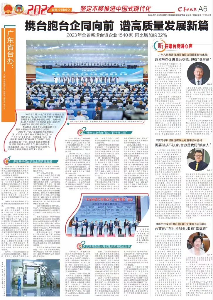2023年,中共广东省委台湾工作办公室、广东省人民政府台湾事务办公室(以下简称“广东省台办”)围绕省委“1310”具体部署,持续开展“惠台暖企”行动和“台资高质量发展”行动,落实落细各项惠台政策,不断促进粤台经贸合作,推动台资台企高质量发展,为广东在推进中国式现代化建设中走在前列作出新的更大贡献。