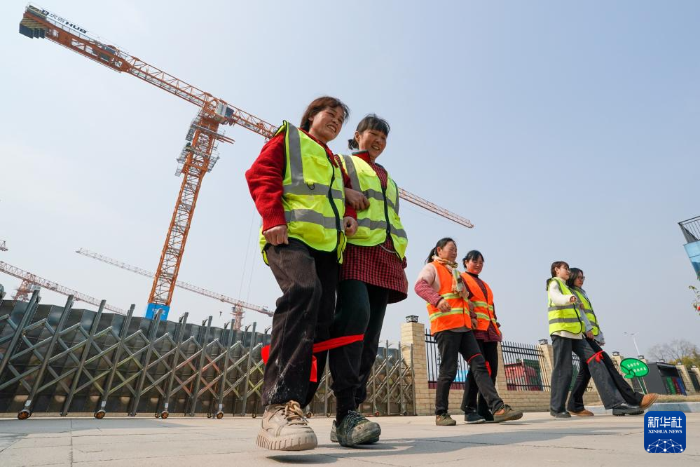 3月7日,在江苏南京,中建三局一公司扬子江智慧中心项目的女职工们在进行“两人三足”游戏。