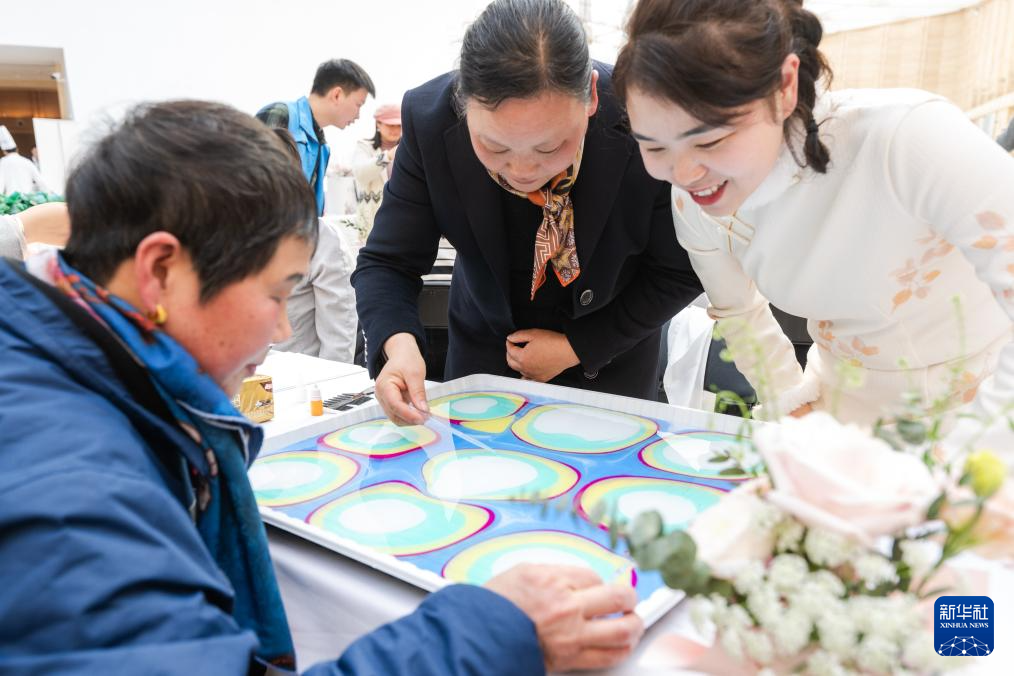 3月7日,在湖北武汉,来自建筑工程一线的女职工(左)在中国建筑科技馆参加水拓丝巾手工体验活动。