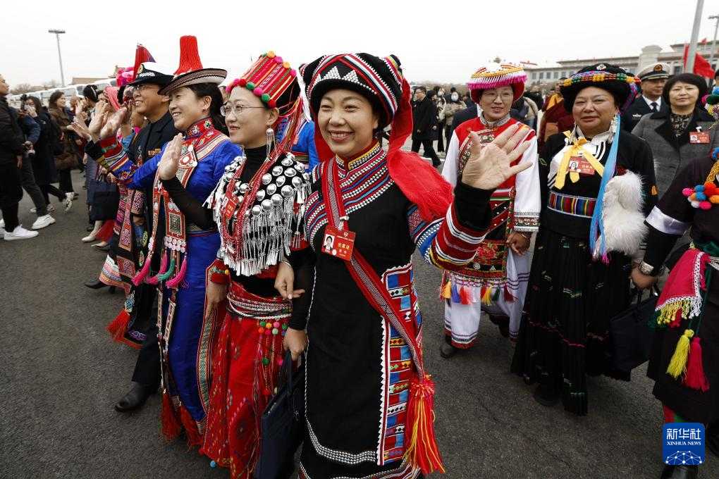 3月4日,身着民族服饰的政协委员们走向人民大会堂,准备参加全国政协十四届二次会议开幕会。