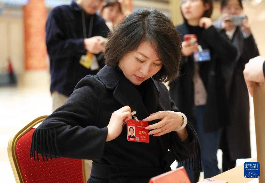 3月3日,顾卫英代表在北京代表团驻地签到后佩戴自己的证件。