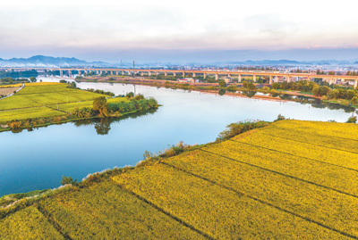 浙江诸暨市牌头镇,农田间绿水环绕,远处高铁穿行而过,绘就一幅色彩丰富的风光画卷。