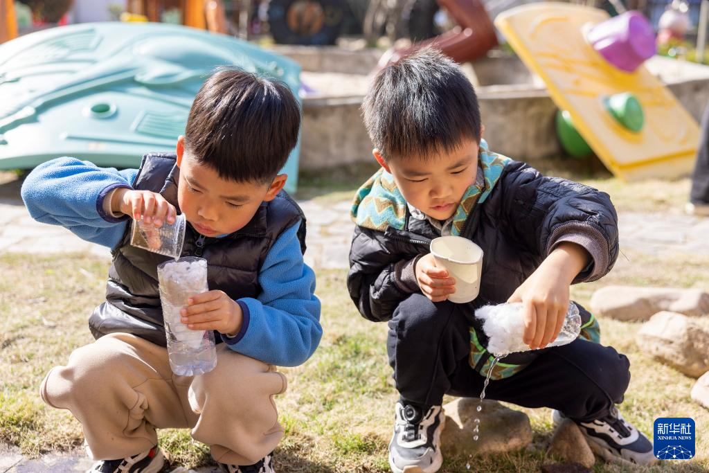 3月21日,浙江省诸暨市城东幼儿园的小朋友在园内的水池边取水放入自制净水器。
