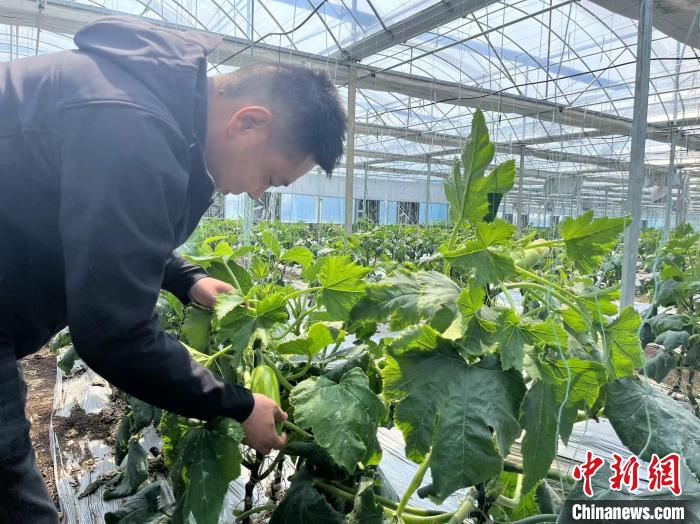 3月19日,江西省金溪县金品冠农业发展有限公司总经理程贤杰查看西葫芦生长情况。王剑 摄