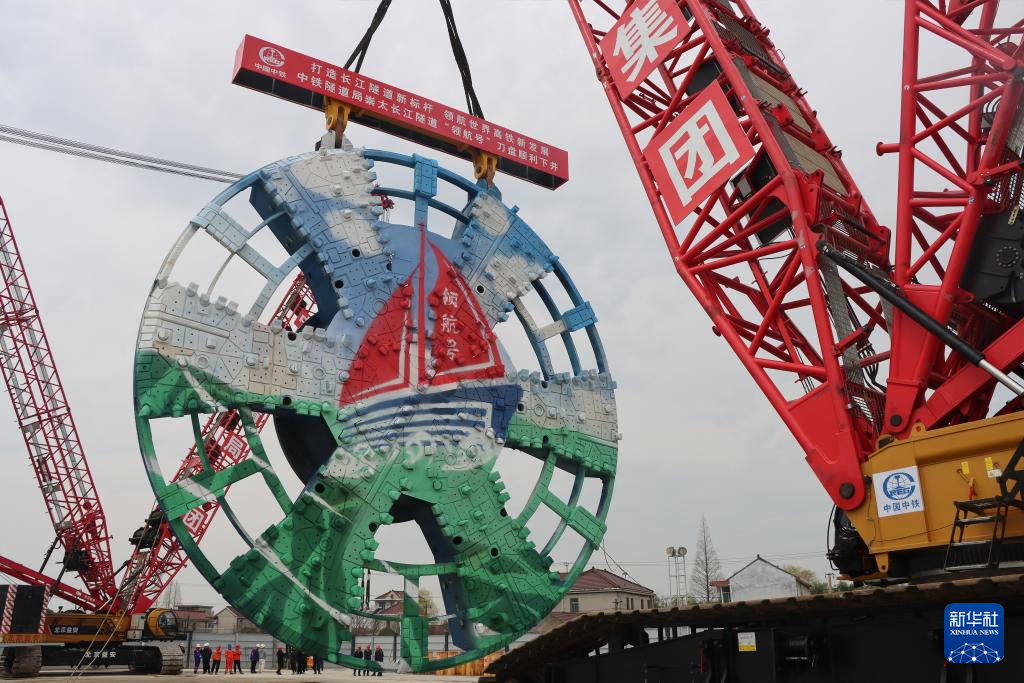3月27日,在上海市崇明区,“领航号”盾构机刀盘准备下井。(新华社记者 王辰阳 摄)