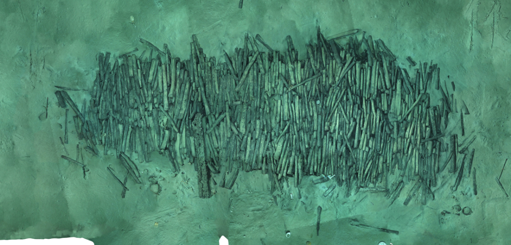 南海西北陆坡二号沉船遗址位于一号沉船遗址东北约12海里处,核心区为大量排列整齐、码放有序的原木堆积,长约21米,最宽约8米,年代为明弘治年间。