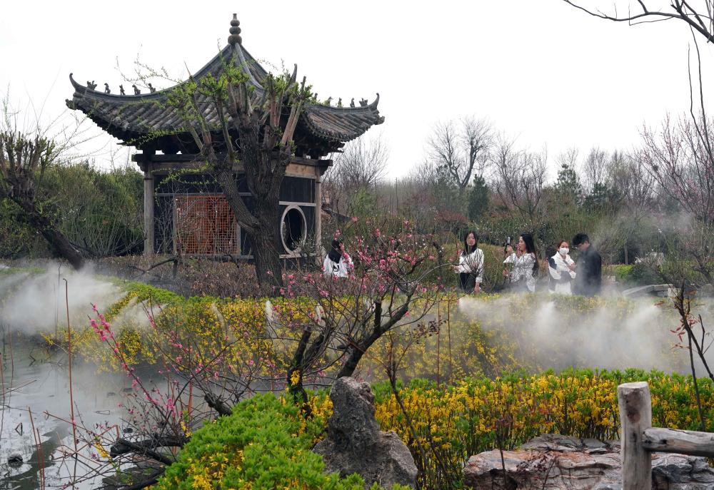 游客在位于河南省鄢陵县的一处园林内拍照(3月26日摄)。